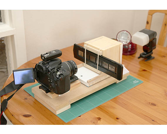 The homemade rig of bits of wood, elastic bands and a neg holder. The Canon 60D was used for its articulated screen. The flash at the rear has a radio trigger. The spotlight at the rear illuminated the neg to align the change and for focus.